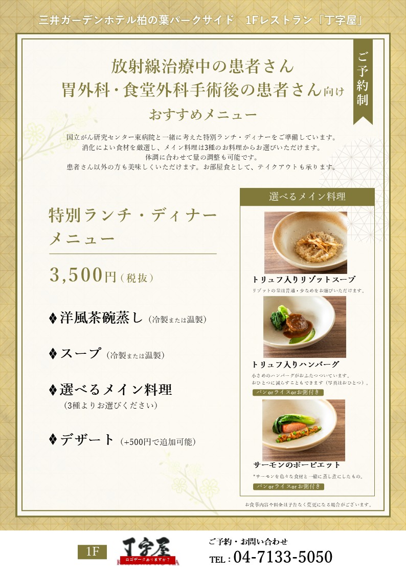 三井ガーデンホテル柏の葉パークサイドでは、国立がん研究センター東病院と連携し、「がん患者さんに寄り添うホテル」として、宿泊だけでなく、食事の時間においても安心して過ごしていただける環境づくりに取り組んでいます。1階レストラン「丁字屋」では、体調や治療状況に配慮した患者さん向けメニューを提供してきました。